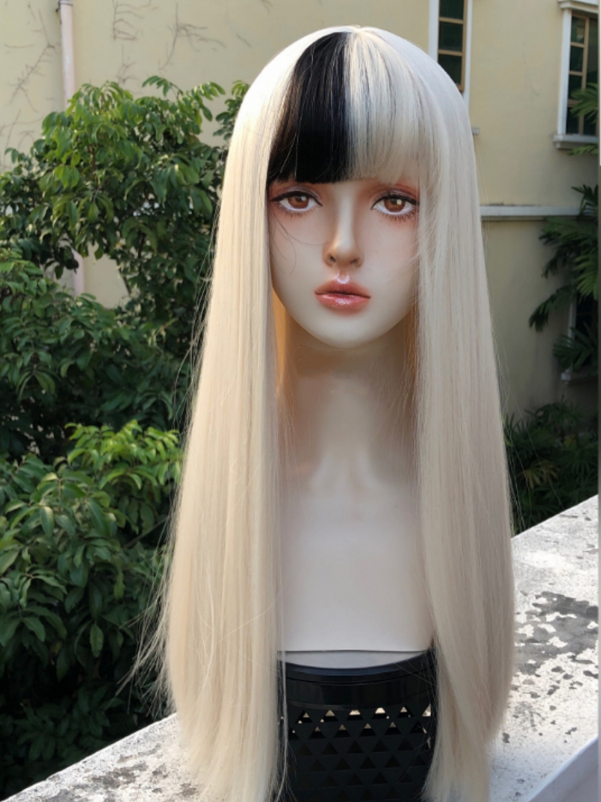 2021 new style blonde and black mixed color long straight synthetic wig with bangs.